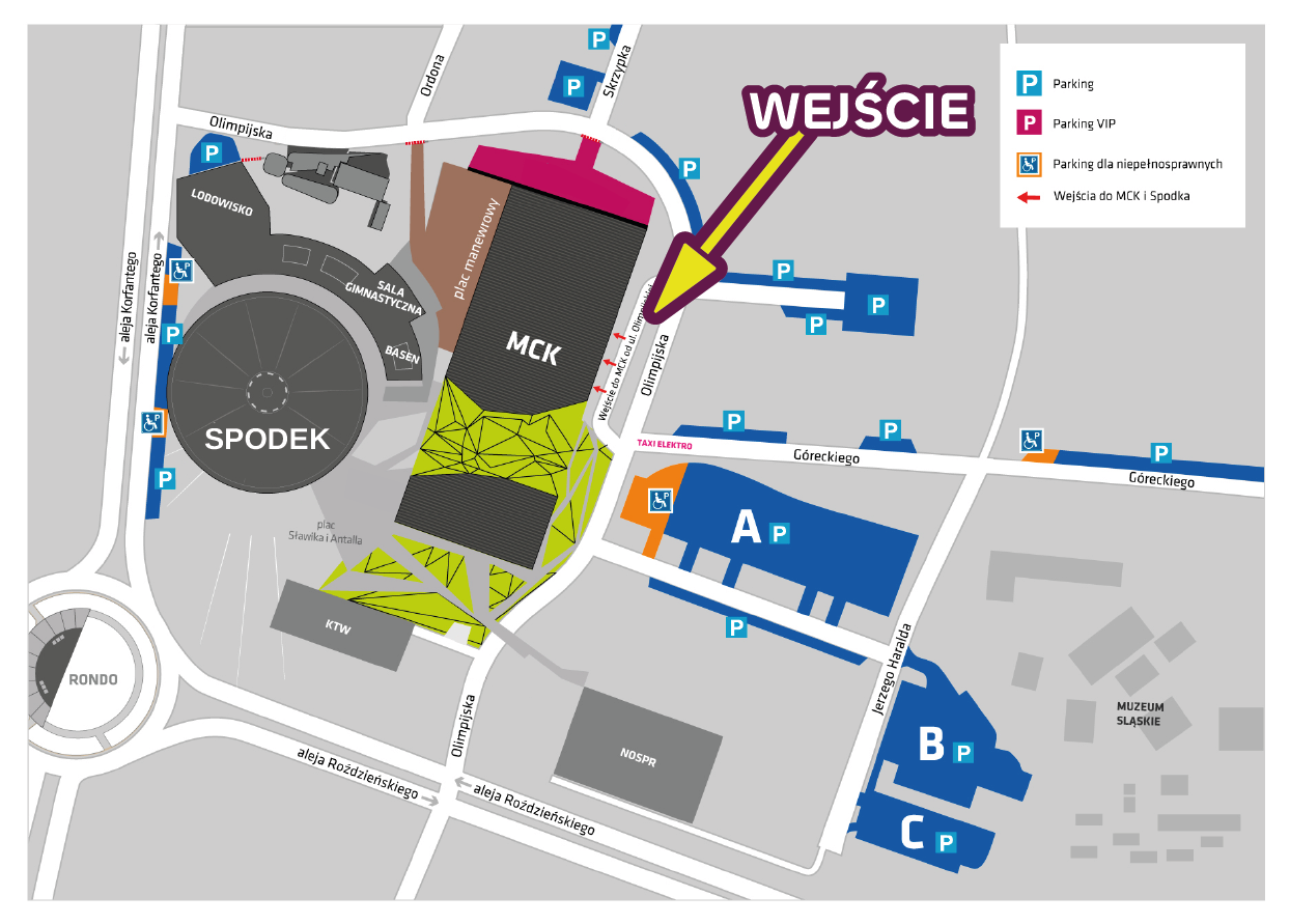 Spodek i MCK znajdują się w centrum Katowic i są bardzo dobrze skomunikowane. Poniżej przedstawiamy wskazówki dojazdu przy użyciu komunikacji miejskiej, pociągu i własnego samochodu.